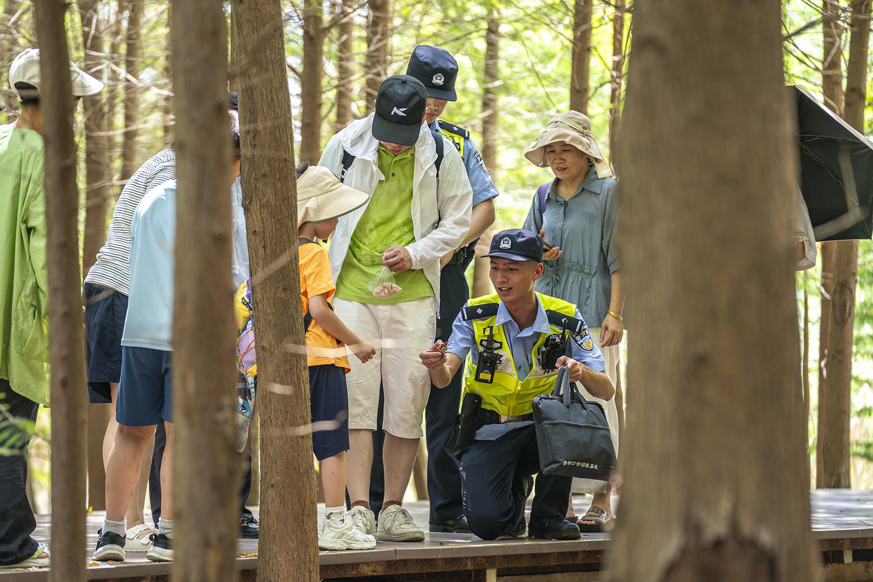 上海市公安局崇明分局三星派出所根據(jù)西沙濕地公園暑假旺季客流情況,創(chuàng)新探索“警景共建”模式,聯(lián)合公園開展生態(tài)巡查、安全提示和服務(wù)群眾等工作。