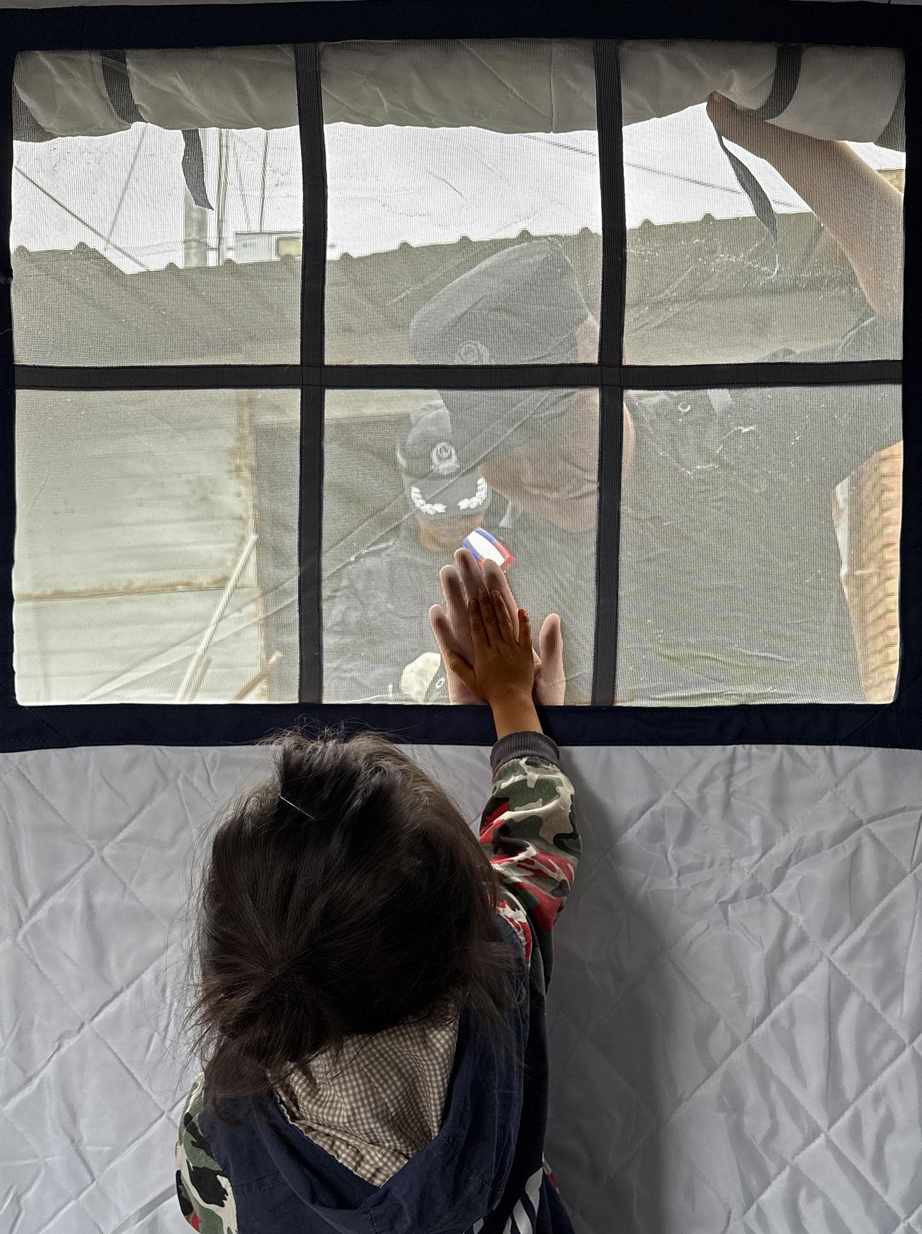 8月14日,瑤瑤在帳篷里給輔警張?jiān)品迥樕腺N貼紙。金萬貴 攝