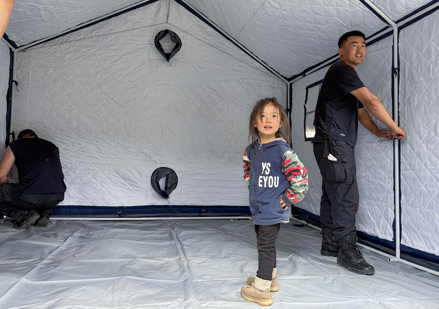 當(dāng)瑤瑤看到叔叔們真的帶著禮物回來時(shí),小臉?biāo)查g樂開了花。她迫不及待地撕下貼紙,踮起腳尖,小心翼翼地貼在蘇明凱和張?jiān)品宓哪樕??!笆迨?,那邊臉上再給你貼一個(gè)!咯咯咯……”帳篷里,孩子銀鈴般的笑聲像一束溫暖的陽(yáng)光,穿透了災(zāi)后的陰霾。