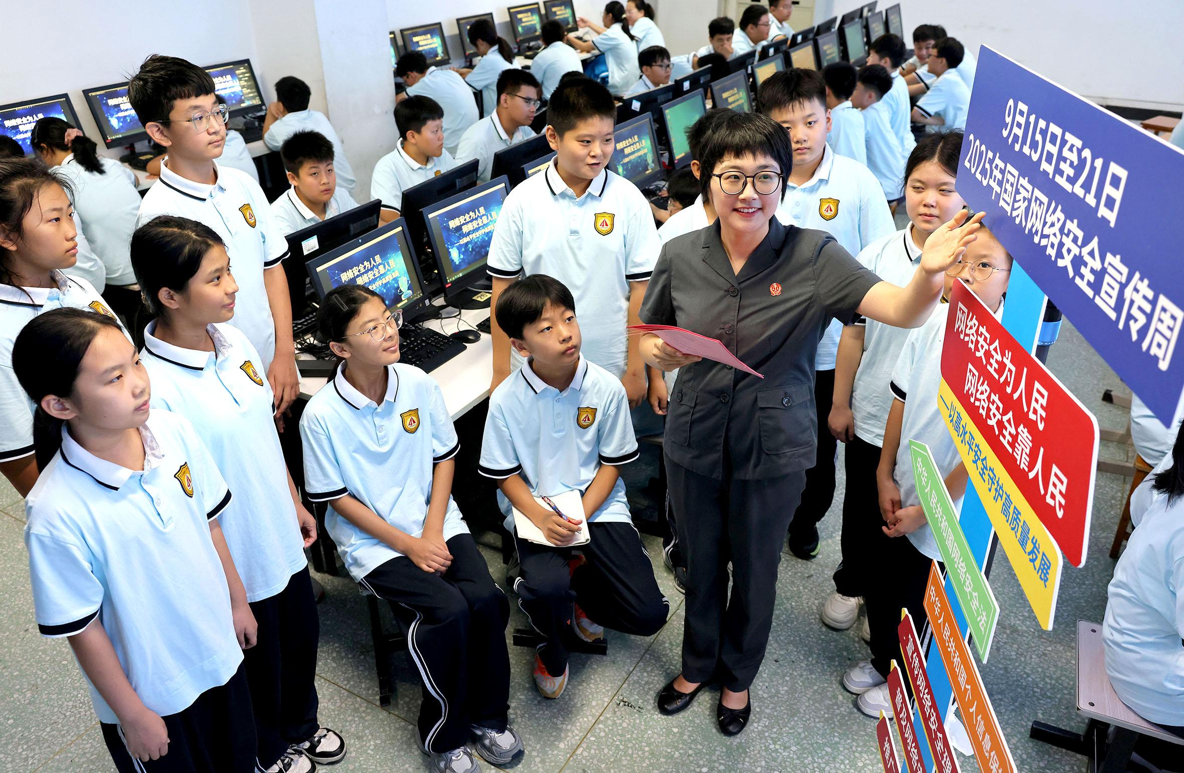 9月15日,在山東省棗莊市第四十一中學,棗莊市市中區(qū)人民法院的法官為學生們普及網絡安全知識。