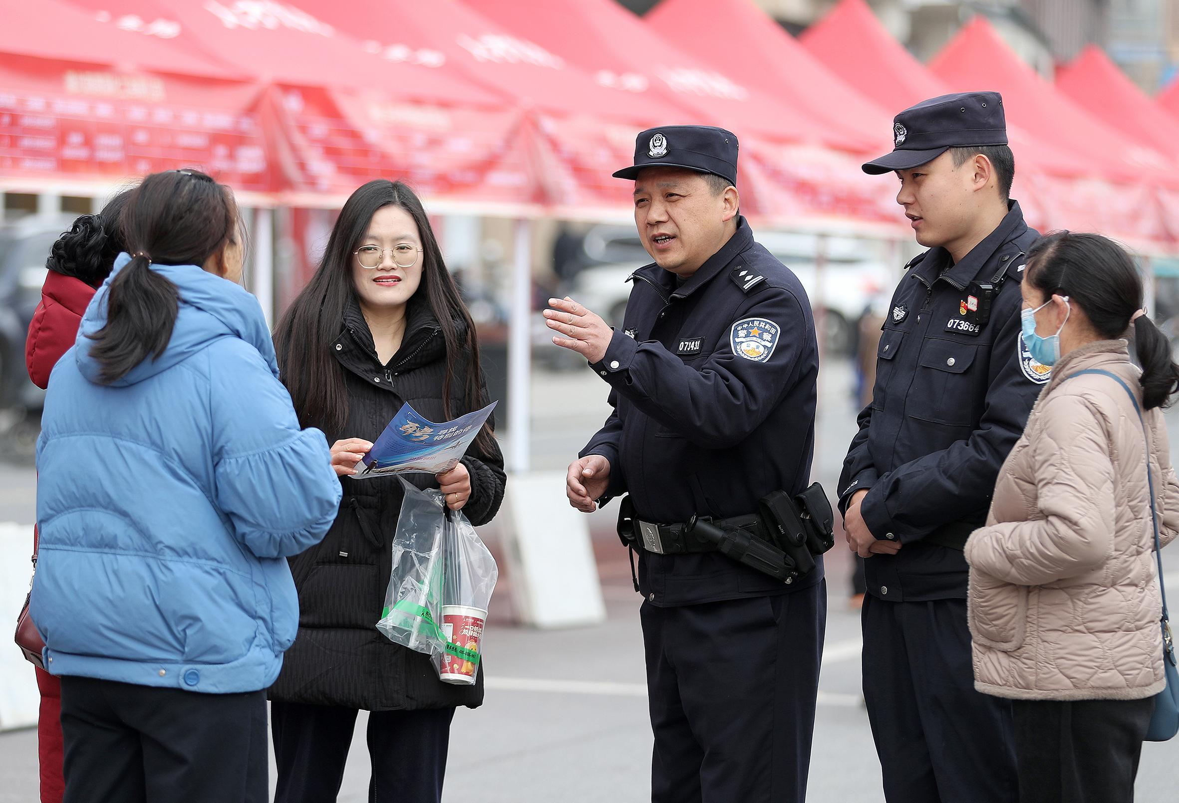 2月27日,在湖北省荊門市東寶區(qū)“春風(fēng)行動”招聘會現(xiàn)場,荊門市公安局東寶區(qū)分局民警聯(lián)合龍泉街道禁毒志愿者,帶著禁毒宣傳手冊、仿真毒品模型,向求職者開展禁毒普法宣傳。