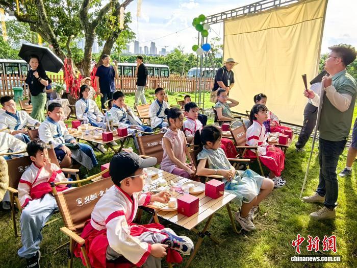 “投壺是古代宴飲時做的一種投擲游戲,也是一種禮儀,請大家站在這里,把手中的箭投向壺里,投中就可以得分……”在“51趣·北大”帳篷營地,“少年行”研學(xué)機(jī)構(gòu)的老師戴曙正帶著約20名兒童開展研學(xué)活動。