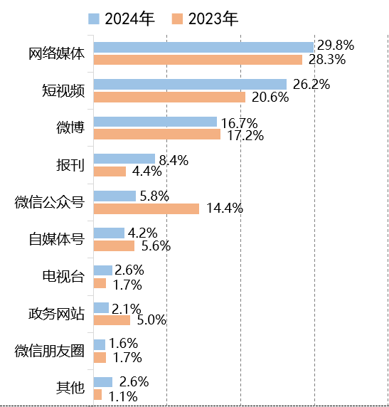 2024年,網絡媒體、短視頻、微博穩(wěn)居政法輿情發(fā)酵的主陣地,相關平臺產生的輿情數量占比累計72.7%。報刊、電視臺等專業(yè)性較強的傳統媒體仍占一席之地,由此發(fā)酵的輿情數量比重均有增長。相比之下,源于微博、微信公眾號與政務網站的輿情數量有所減少。