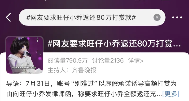 話題#網(wǎng)友要求旺仔小喬返還80萬(wàn)打賞款#引發(fā)熱議。