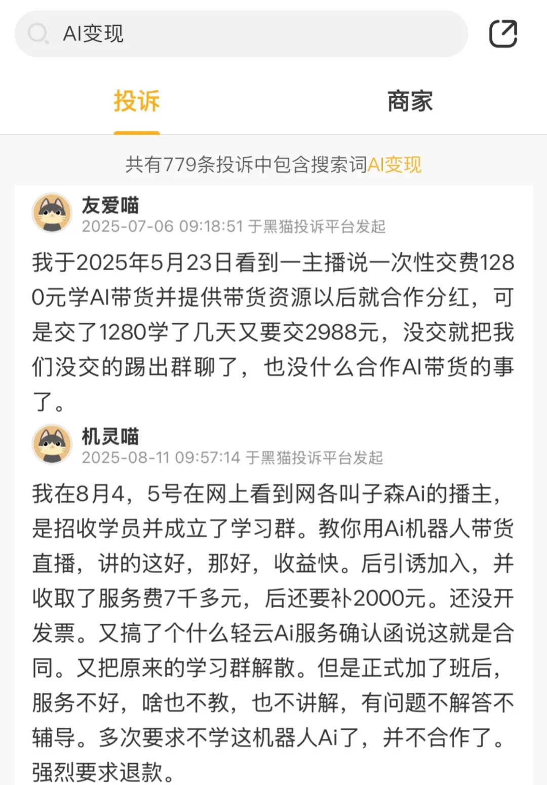 在黑貓投訴平臺上,有關(guān)“AI變現(xiàn)”的投訴已達700多條。不少投訴者提到,購買課程后不僅沒學(xué)到實質(zhì)內(nèi)容,還被商家誘導(dǎo)二次消費,一旦拒絕二次消費,就會被直接踢出交流群。