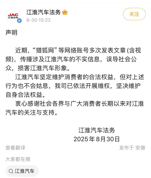 而在前一天的8月30日,@江淮汽車法務發(fā)布聲明:近期,“獵狐網(wǎng)”等網(wǎng)絡賬號多次發(fā)表文章(含視頻),傳播涉及江淮汽車的不實信息,誤導社會公眾,損害江淮汽車形象。江淮汽車堅定維護消費者的合法權益,但對上述行為也不會姑息,我司已依法開展維權,堅決維護自身合法權益。