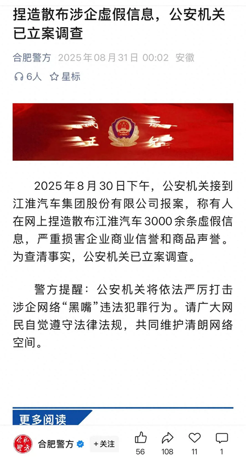 8月31日凌晨,“合肥警方”微信公眾號發(fā)文稱,2025年8月30日下午,公安機關接到江淮汽車集團股份有限公司報案,稱有人在網(wǎng)上捏造散布江淮汽車3000余條虛假信息,嚴重損害企業(yè)商業(yè)信譽和商品聲譽。為查清事實,公安機關已立案調(diào)查。