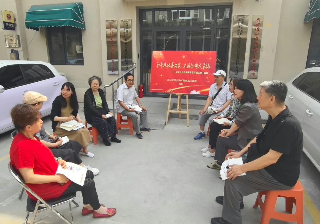 “和平夜話(huà)再出發(fā),立法征詢(xún)大家說(shuō)”,天津小白樓街道基層立法聯(lián)系點(diǎn)到社區(qū)征集對(duì)生態(tài)環(huán)境法典(草案)的意見(jiàn)。(全國(guó)人大常委會(huì)法工委供圖)