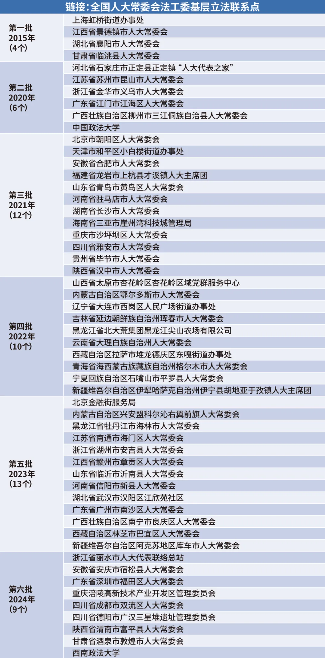 之后,2020年7月,《工作規(guī)則》首次修訂,通過(guò)豐富聯(lián)系點(diǎn)形式、強(qiáng)化輻射功能,基層立法聯(lián)系點(diǎn)進(jìn)入擴(kuò)容提質(zhì)的快車(chē)道。截至目前,全國(guó)人大常委會(huì)法工委設(shè)立54個(gè)基層立法聯(lián)系點(diǎn),實(shí)現(xiàn)全國(guó)31個(gè)省(區(qū)、市)設(shè)點(diǎn)全覆蓋。