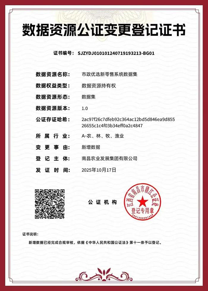 2024年7月,南昌農(nóng)業(yè)發(fā)展集團(tuán)通過江西省數(shù)據(jù)資源公證登記平臺,申請為其搭建的“市政優(yōu)選新零售系統(tǒng)數(shù)據(jù)集”進(jìn)行數(shù)據(jù)資源公證登記。同年7月28日,南昌市贛江公證處向該數(shù)據(jù)集發(fā)放了《數(shù)據(jù)資源持有權(quán)登記證書》,這也是全國首例經(jīng)公證登記確權(quán)的全資國企農(nóng)業(yè)數(shù)據(jù)。