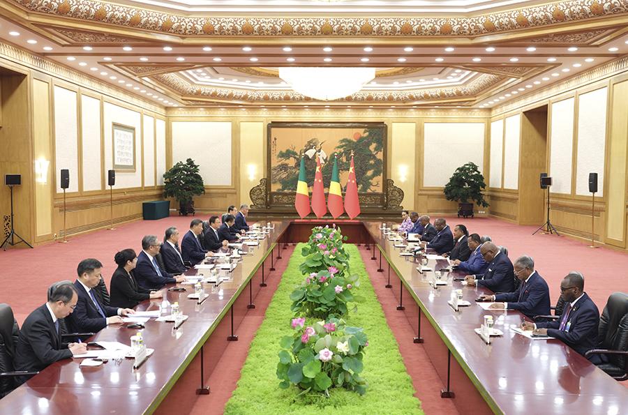 9月4日中午,國家主席習(xí)近平在北京人民大會堂會見來華出席紀(jì)念中國人民抗日戰(zhàn)爭暨世界反法西斯戰(zhàn)爭勝利80周年活動的剛果(布)總統(tǒng)薩蘇。
