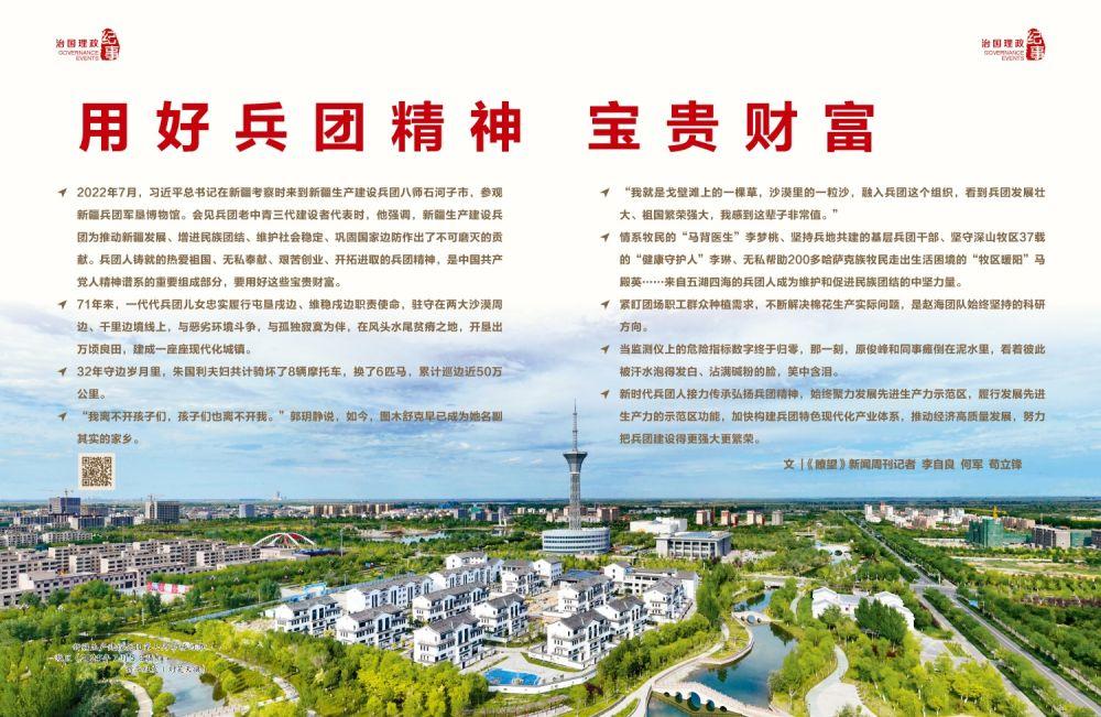 ◇2022年7月,習(xí)近平總書記在新疆考察時來到新疆生產(chǎn)建設(shè)兵團八師石河子市,參觀新疆兵團軍墾博物館。會見兵團老中青三代建設(shè)者代表時,他強調(diào),新疆生產(chǎn)建設(shè)兵團為推動新疆發(fā)展、增進民族團結(jié)、維護社會穩(wěn)定、鞏固國家邊防作出了不可磨滅的貢獻。兵團人鑄就的熱愛祖國、無私奉獻、艱苦創(chuàng)業(yè)、開拓進取的兵團精神,是中國共產(chǎn)黨人精神譜系的重要組成部分,要用好這些寶貴財富。
