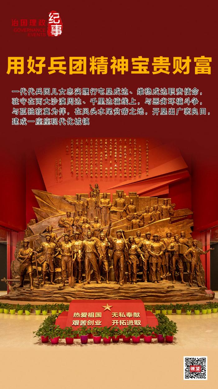 2022年7月,習(xí)近平總書記在新疆考察時來到新疆生產(chǎn)建設(shè)兵團八師石河子市,參觀新疆兵團軍墾博物館。會見兵團老中青三代建設(shè)者代表時,他強調(diào),新疆生產(chǎn)建設(shè)兵團為推動新疆發(fā)展、增進民族團結(jié)、維護社會穩(wěn)定、鞏固國家邊防作出了不可磨滅的貢獻。兵團人鑄就的熱愛祖國、無私奉獻、艱苦創(chuàng)業(yè)、開拓進取的兵團精神,是中國共產(chǎn)黨人精神譜系的重要組成部分,要用好這些寶貴財富。