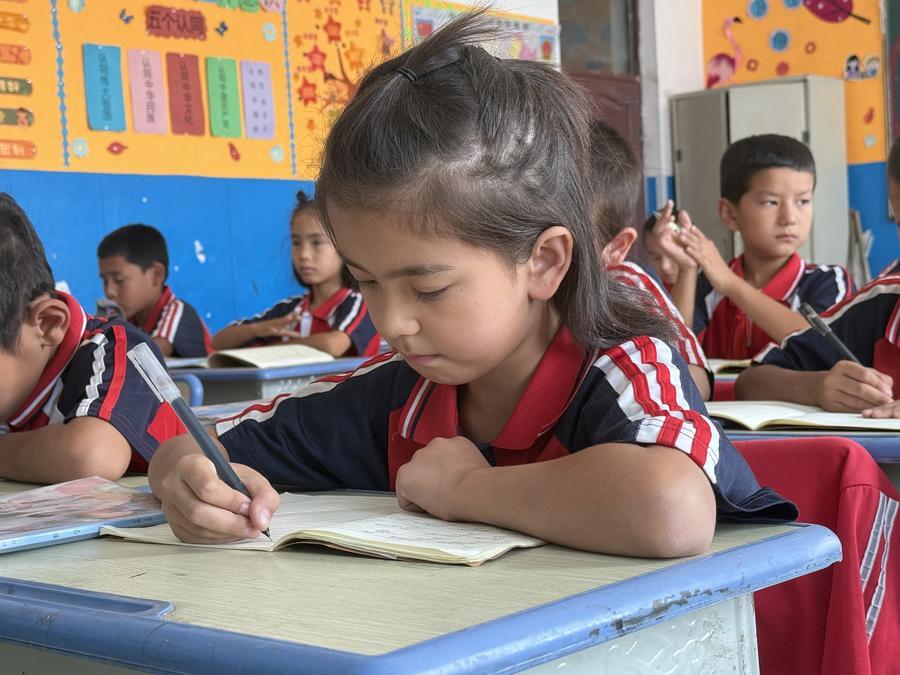 9月17日,鄯善縣達朗坎鄉(xiāng)中心學(xué)校三年級四班學(xué)生乃則熱與同學(xué)們上數(shù)學(xué)課。(受訪者供圖)