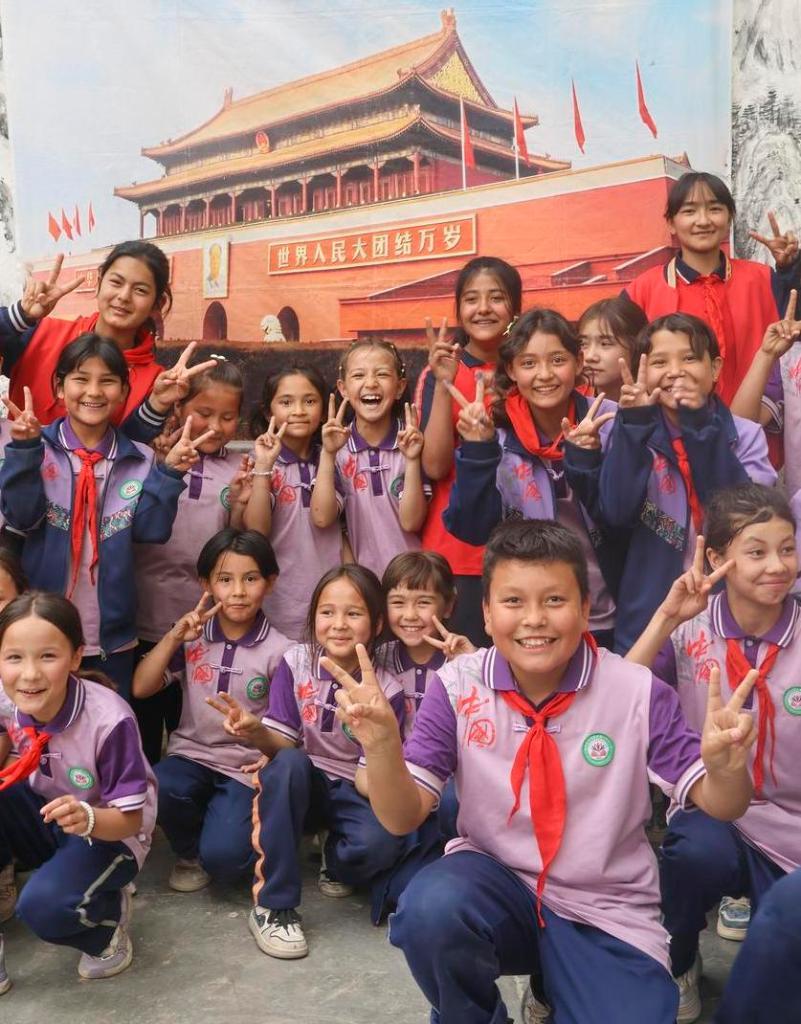 一次拍合影,70多歲的老人摸著背景布上的紅墻,念叨著:“你看現(xiàn)在,我們住的房是北京援疆修的,孩子校服上印著‘北京援疆’,連天安門都‘來’沙漠看我們了!”