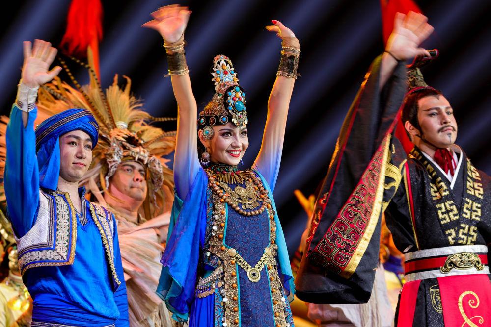 2022年4月22日,在新疆藝術(shù)劇院木卡姆藝術(shù)團(tuán)劇場(chǎng),舞蹈演員馬依熱·艾買(mǎi)提江(中)在舞劇《張騫》演出后向觀眾致謝。馬依熱來(lái)自烏魯木齊,11歲時(shí)前往北京跟隨專(zhuān)業(yè)舞蹈老師學(xué)習(xí),學(xué)成后回到家鄉(xiāng),成為新疆藝術(shù)劇院歌舞團(tuán)的一名舞蹈演員。“新疆的歌舞是中華傳統(tǒng)文化的一部分,是用來(lái)歌頌美好生活的。希望我的舞蹈,能增進(jìn)各民族間的感情,促進(jìn)文化交融。”馬依熱說(shuō)。