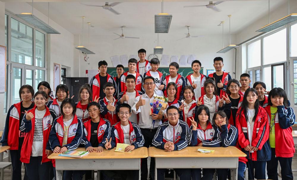2024年9月10日,在新疆阿拉爾職業(yè)技術(shù)學(xué)校,援疆教師李斌傲(中)和23級(jí)電商班的學(xué)生合影?!?5后”年輕教師李斌傲是第十一批浙江臺(tái)州到新疆阿拉爾職業(yè)技術(shù)學(xué)校援疆教師中的一員,負(fù)責(zé)教授電子商務(wù)專(zhuān)業(yè)課程。他在學(xué)校主導(dǎo)籌建了電商實(shí)訓(xùn)室,還帶了4個(gè)新入職的教師當(dāng)徒弟?!芭嘤?xùn)好本地教師,就是打造一支帶不走的隊(duì)伍。”李斌傲說(shuō)。