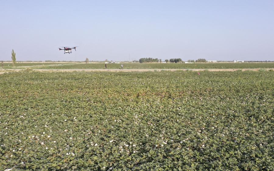 在新疆尉犁縣興平鎮(zhèn)達(dá)西村一處高標(biāo)準(zhǔn)農(nóng)田,種植戶(hù)用無(wú)人機(jī)噴灑脫葉劑(2022年9月20日攝,無(wú)人機(jī)照片)。新華社發(fā)(汪志鵬 攝)
