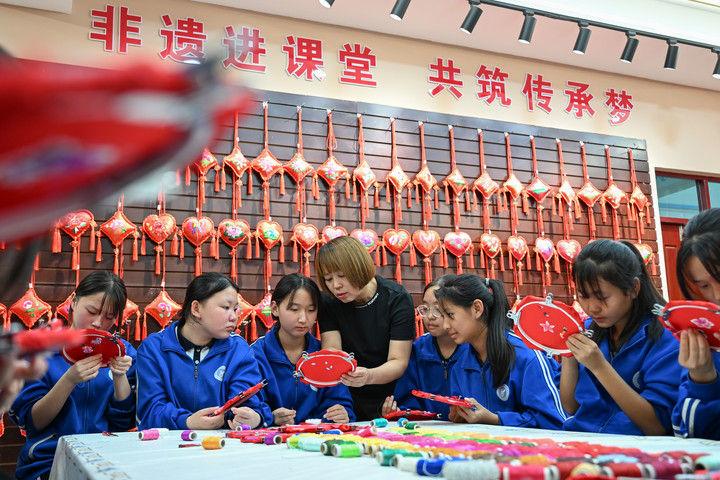 2025年9月26日,內(nèi)蒙古興安盟科右中旗巴彥呼舒第六中學(xué)美術(shù)教師、非遺代表性傳承人吳斯琴(左四)指導(dǎo)學(xué)生刺繡。近年來,內(nèi)蒙古興安盟科爾沁右翼中旗巴彥呼舒第六中學(xué)將當(dāng)?shù)貒壹壏沁z圖什業(yè)圖刺繡引入校園,開設(shè)校本課程,并成立興趣社團,在豐富校園文化生活的同時,讓學(xué)生們近距離感受非遺的魅力,弘揚和傳承中華優(yōu)秀傳統(tǒng)文化。