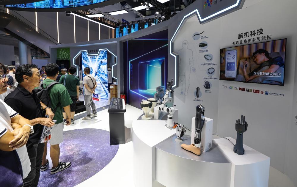 9月25日,在第四屆全球數(shù)字貿(mào)易博覽會數(shù)智未來主題展區(qū)的杭州六小龍專區(qū),觀眾在觀看強(qiáng)腦科技的智能仿生手。新華社記者 徐昱 攝