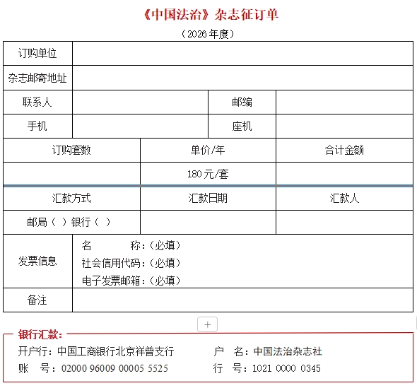 ★匯款時請務(wù)必標明“中國法治+訂購套數(shù)”,個人匯款另需注明“單位名稱”。