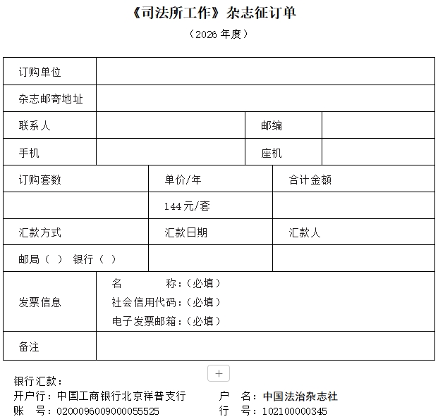 若不能進(jìn)行在線提交訂單,請將本征訂單填寫完整后與匯款憑證一并發(fā)郵件至sfsgzfxb@moj.gov.cn或添加微信13681283507/13681570831后發(fā)送電子版征訂單與匯款憑證。