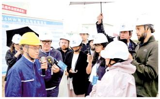 圖為9月19日,中外媒體記者在位于山東東營的26兆瓦級(jí)海上風(fēng)力發(fā)電機(jī)組項(xiàng)目現(xiàn)場(chǎng)采訪。 新華社發(fā)