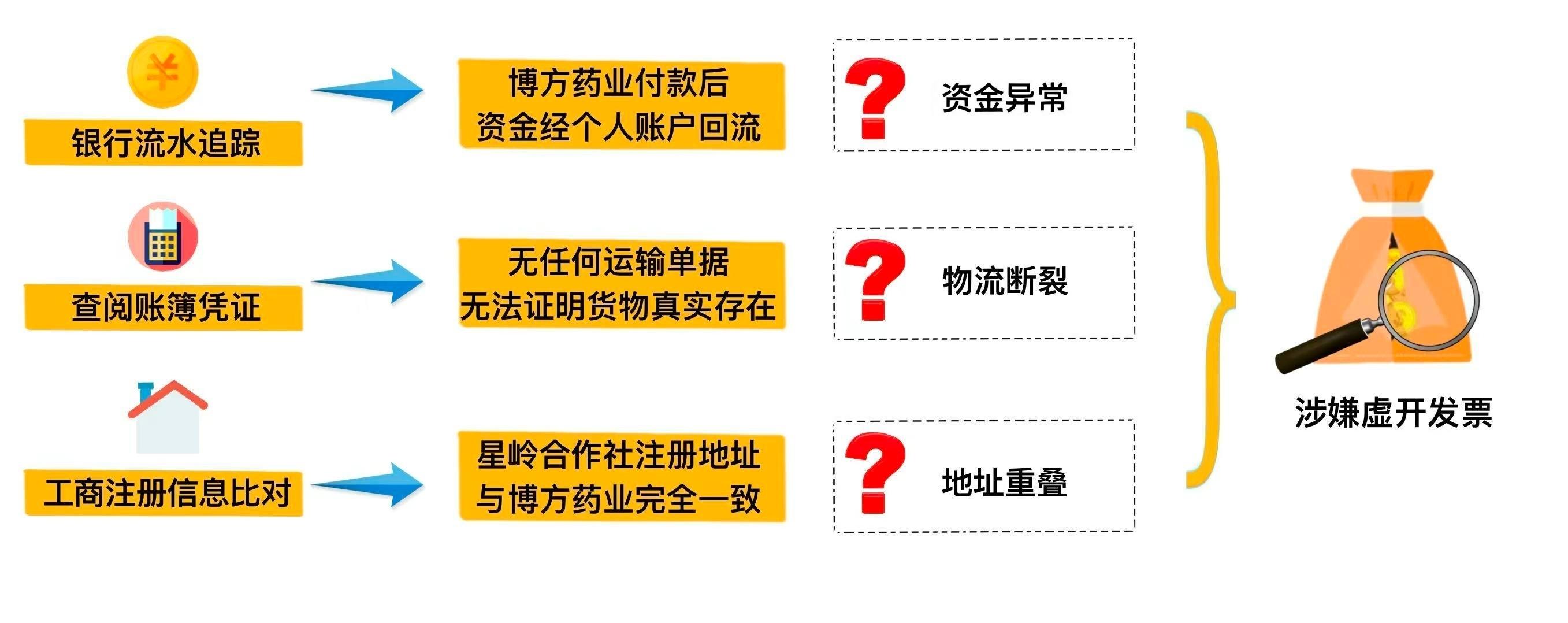 檢查人員通過依法調(diào)取的銀行流水查明,博方藥業(yè)向星嶺合作社支付款項(xiàng)累計(jì)359.66萬元,這些資金先轉(zhuǎn)入該合作社法定代表人的個(gè)人賬戶,經(jīng)多個(gè)個(gè)人賬戶中轉(zhuǎn)后,最終回流至博方藥業(yè)法定代表人賬戶。而博方藥業(yè)僅向旺禾合作社支付5200元,卻取得了近千萬元的農(nóng)產(chǎn)品銷售發(fā)票。