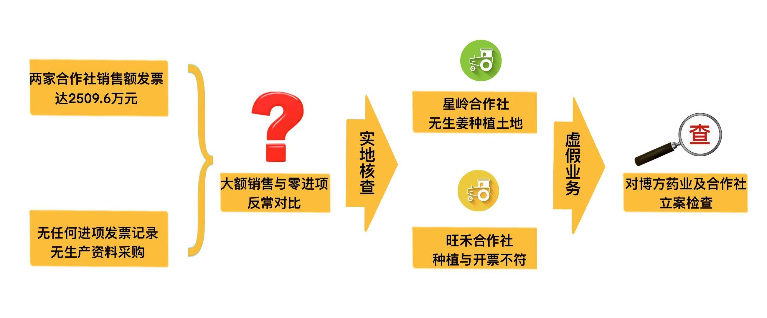 為核實(shí)情況,稅務(wù)人員前往兩家合作社的生產(chǎn)經(jīng)營地實(shí)地調(diào)查。通過走訪得知,星嶺合作社在當(dāng)?shù)貨]有任何生姜種植土地及種植業(yè)務(wù)。而旺禾合作社2021年實(shí)際未種植生姜,2022年至2023年雖有種植,按實(shí)際產(chǎn)量及當(dāng)時(shí)市場(chǎng)平均收購價(jià)核算,合理銷售額不足100萬元,且無外購生姜記錄,卻向博方藥業(yè)開具了775.26萬元的銷售發(fā)票。