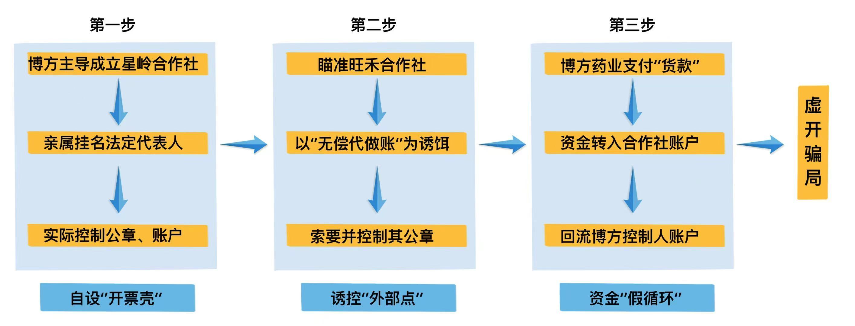 至此,博方藥業(yè)精心設(shè)計(jì)的虛開鏈條逐漸清晰。第一步是自設(shè)“開票殼”。主導(dǎo)成立星嶺合作社,將親屬登記為法定代表人,實(shí)際掌控公章、對(duì)公賬戶及相關(guān)個(gè)人賬戶,完全主導(dǎo)發(fā)票開具業(yè)務(wù)。第二步是誘控“外部點(diǎn)”。針對(duì)旺禾合作社法定代表人不懂財(cái)務(wù)的特點(diǎn),以“無償代理做賬報(bào)稅”為誘餌,索取合作社公章后實(shí)際操控開票,將其也納入虛開渠道。第三步是資金“假循環(huán)”。此前流向星嶺合作社的359.66萬元為虛轉(zhuǎn)資金,最終回流至博方法定代表人賬戶。通過織就關(guān)聯(lián)網(wǎng)絡(luò),博方藥業(yè)最終完成了這場(chǎng)虛開騙局。