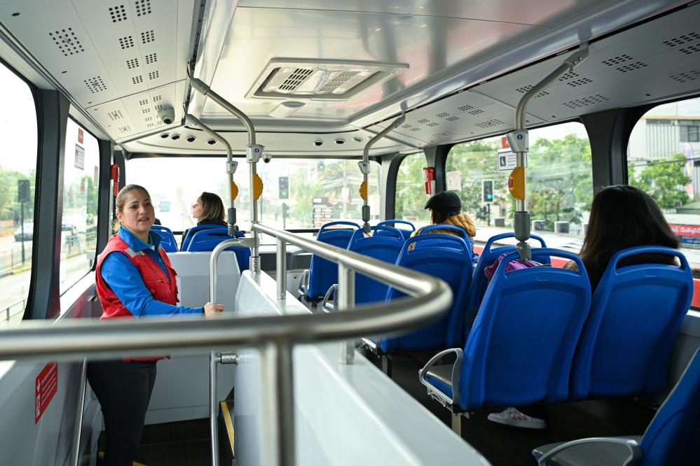 2023年11月2日,在智利首都圣地亞哥,一輛520路新能源公交車的工作人員在車內(nèi)巡視。智利圣地亞哥520路公交路線是為2023泛美運動會特別開設(shè)的。新華社記者辛悅衛(wèi)攝