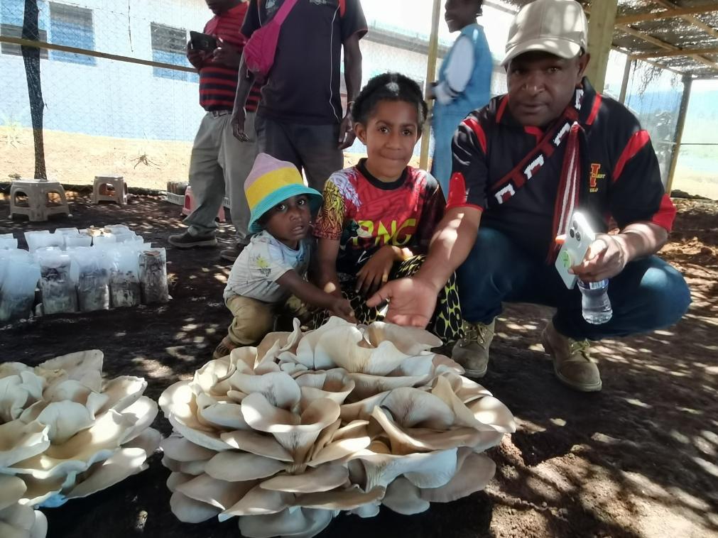 9月29日,在巴布亞新幾內(nèi)亞東高地省首府戈羅卡市,當?shù)孛癖妳⒂^中國援巴布亞新幾內(nèi)亞菌草旱稻項目永久性示范基地種植的大平菇。新華社發(fā)(福建農(nóng)林大學國家菌草工程技術(shù)研究中心供圖)