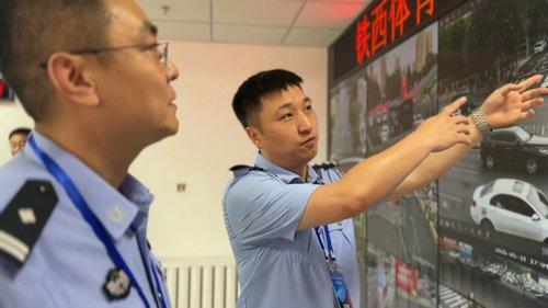 沈陽鐵西民警在監(jiān)控系統(tǒng)前查看鐵西體育場周邊情況。