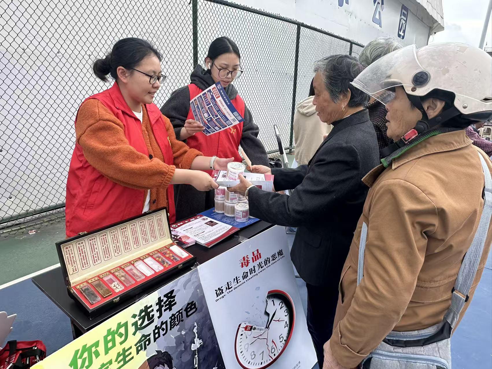 活動還現(xiàn)場設(shè)置多個宣傳服務(wù)點位,平安法治辦公室工作人員與“橋姥爺”“錢塘媽媽”“錢塘灣嫂”等志愿者隊伍共同設(shè)立宣傳攤位,通過發(fā)放宣傳手冊、展示仿真毒品模型、講解典型案例等方式,開展多主題宣教,合力織密老年人“安全防護網(wǎng)”。禁毒社工耐心提醒老年朋友謹遵醫(yī)囑、合理用藥,不輕信所謂“養(yǎng)生補品”“特效藥”,定期清理家中過期藥品,防范藥物濫用風險;“錢塘灣嫂”志愿者發(fā)放交通安全宣傳頁,強調(diào)“一盔一帶”重要性;反詐宣傳員則聚焦養(yǎng)老詐騙常見手法,揭露“保健品詐騙”“投資返利”等常見手段,幫助老人識別騙局,守好他們的“錢袋子”。此外,活動還融入國家安全、反邪教等平安創(chuàng)建內(nèi)容,全面提升老年群體的法治意識和自我保護能力。