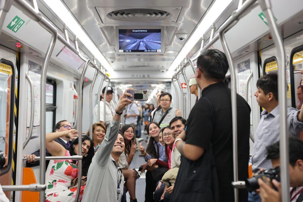 2025年4月23日,在墨西哥首都墨西哥城,媒體記者在地鐵新1號線列車上合影。當日,墨西哥城地鐵新1號線舉行部分通車儀式,中國企業(yè)助力全面升級系統(tǒng)設備,改善市民通勤體驗。