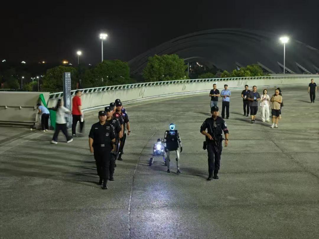 人形機(jī)器人、機(jī)器狗配合安保民警在蘇超賽場開展巡邏