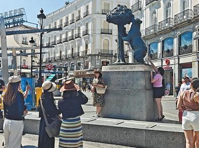 今年夏季,大批中國游客到訪西班牙馬德里。圖為近日,中國游客與馬德里標志性雕塑——熊與樹莓合影。人民日報記者 許海林攝
