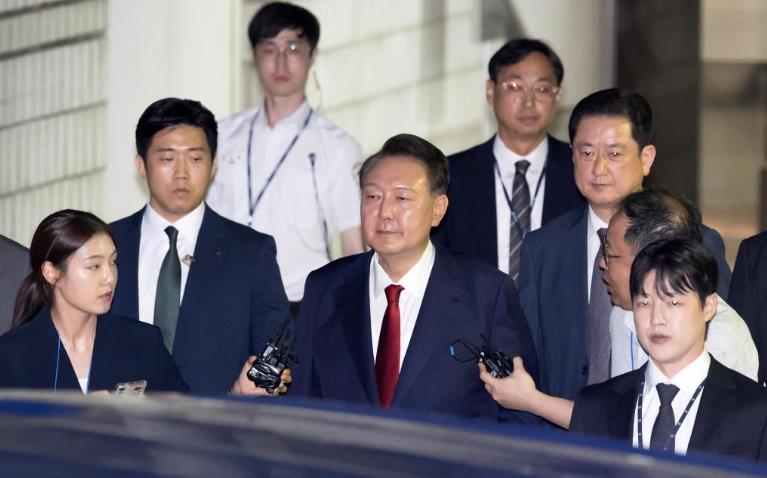 7月9日晚,韓國前總統(tǒng)尹錫悅接受訊問后走出首爾中央地方法院。新華社/紐西斯通訊社
