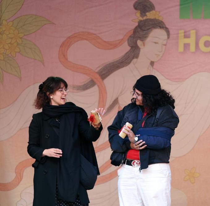 10月5日,當(dāng)?shù)孛癖娫谟鴤惗嘏e行的中秋節(jié)慶祝活動上體驗打快板。新華社記者 李穎 攝