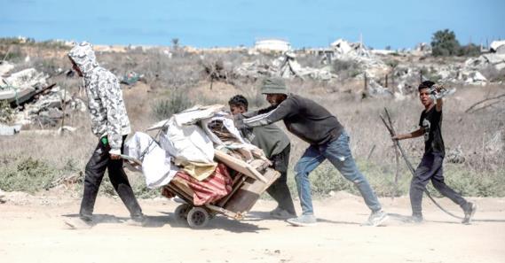 圖為10月11日,加沙地帶南部的巴勒斯坦人經(jīng)由以軍指定通道薩拉赫丁公路返回北方。 新華社發(fā)
