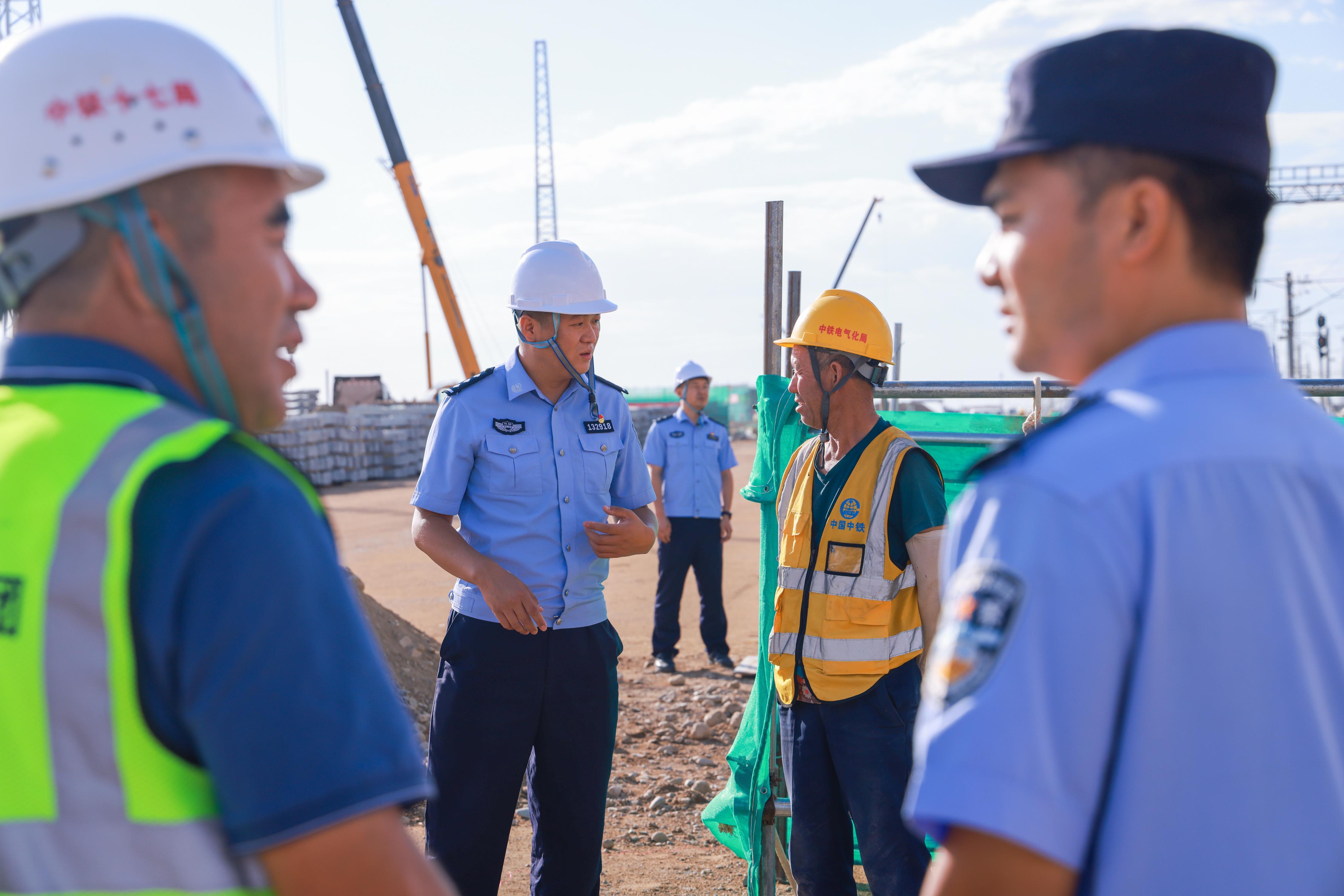 圖為8月20日,哈密公安處刑偵支隊民警在哈密東站施工現(xiàn)場開展“沉浸式”普法宣傳和安全檢查。
