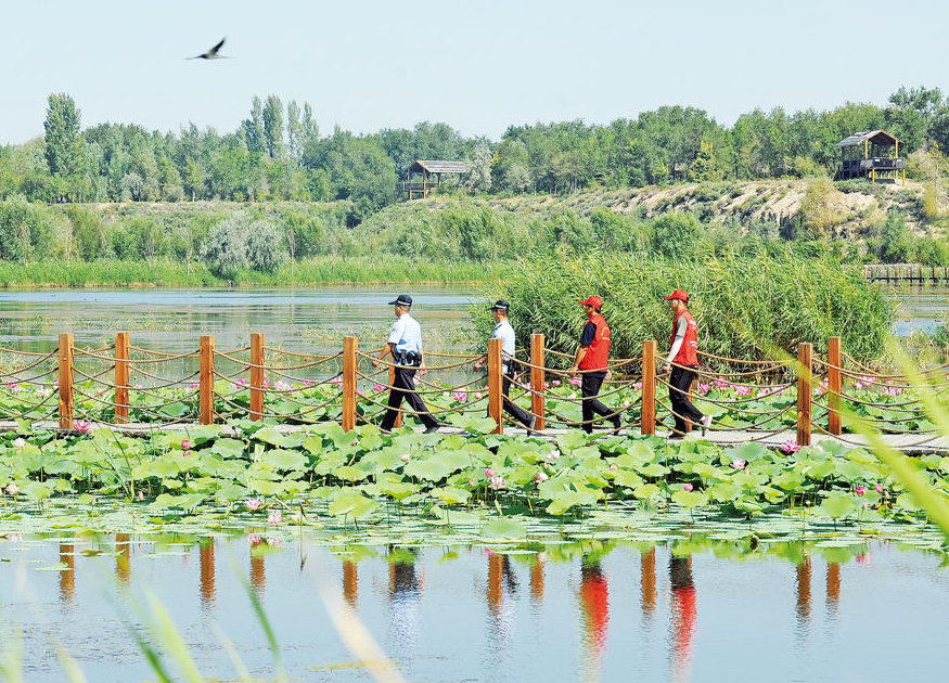 圖為8月19日,瑪納斯縣公安局蘭州灣鎮(zhèn)派出所八家戶警務(wù)室民警與瑪納斯國家濕地公園管委會工作人員一同在瑪納斯國家濕地公園開展巡邏。李進福 攝