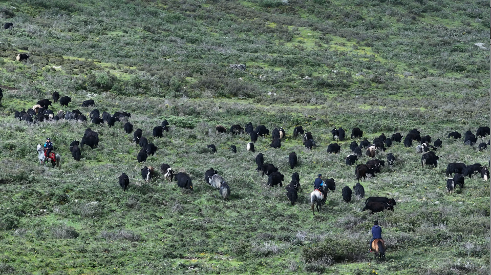 昌戈村夏季牧場地勢平坦,擁有豐富的水草資源,海拔高達4800米。這里,不僅是牦牛的理想棲息地,也是牧民群眾最理想的牧場之一。此次遷徙轉場中,昌戈村牧民呷波、扎西多吉等4家500多頭牦牛浩浩蕩蕩“組團”前行。
