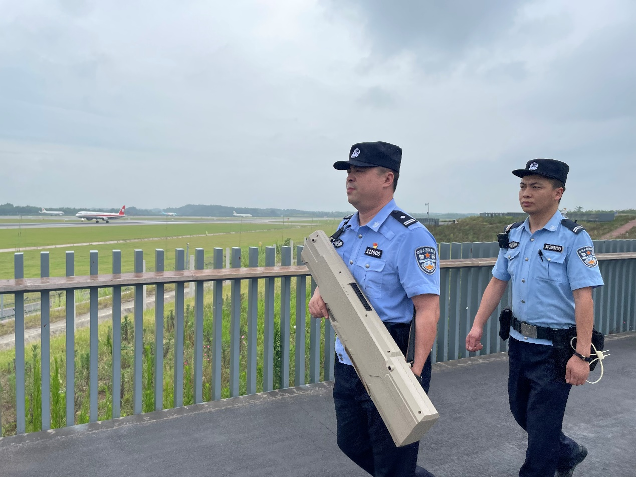 天府國際機(jī)場跑道一側(cè)的萌獅公園,是觀看飛機(jī)起降、一覽機(jī)場全貌的最佳地點(diǎn),吸引了不少游客前來拍照打卡。7月18日,東部新區(qū)公安分局草池派出所的民輔警背著分局配發(fā)的無人機(jī)反制槍,與“凈空觀察哨”隊(duì)員在公園里開展巡邏工作:檢查機(jī)場防護(hù)網(wǎng)是否遭到破壞,在觀察哨瞭望是否有風(fēng)箏、氣球等升空物體干擾航班的情況,向游客進(jìn)行凈空安全知識的宣傳。