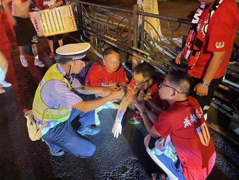 當晚23時20分許,比賽結(jié)束后,樂山市公安局交警支隊直屬一大隊牛咡橋中隊交警馬濤和王飛仍堅守在市中區(qū)新廣場執(zhí)勤點巡邏執(zhí)勤,發(fā)現(xiàn)一名剛剛從擺渡車上下來的球迷突然摔倒在地。
