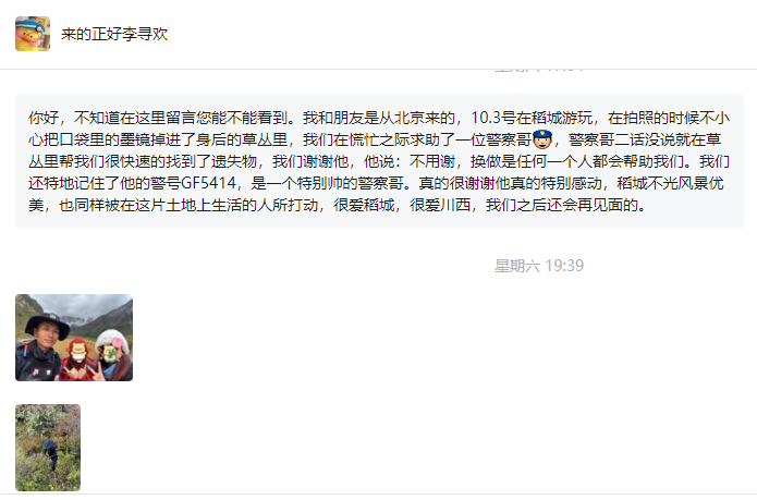 “你好,不知道在這里留言您能不能看到。我和朋友是從北京來的,10月3號日在稻城游玩,在拍照的時候不小心把口袋里的墨鏡掉進了身后的草叢里,我們在慌忙之際求助了一位警察哥,警察哥二話沒說就在草叢里幫我們很快速的找到了遺失物,我們謝謝他,他說:不用謝,換做是任何一個人都會幫助我們。我們還特地記住了他的警號GF5414,是一個特別帥的警察哥。真的很謝謝他真的特別感動,稻城不光風景優(yōu)美,也同樣被在這片土地上生活的人所打動,很愛稻城,很愛川西,我們之后還會再見面的。”
