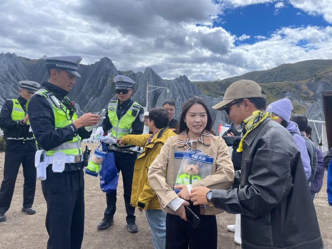10月1日,在國慶“黃金周”首日,道孚縣八美鎮(zhèn)墨石公園景區(qū)迎來了第一批打卡的游客。道孚縣公安局交警大隊也為遠道而來的客人們,準備了一份精美的小禮品,包含“交警小熊”“水杯”“雨傘”等,游客們只需要回答交警現(xiàn)場開展的“假期平安行·交通安全知識競賽”,答對題目就能帶著禮品繼續(xù)環(huán)游甘孜。