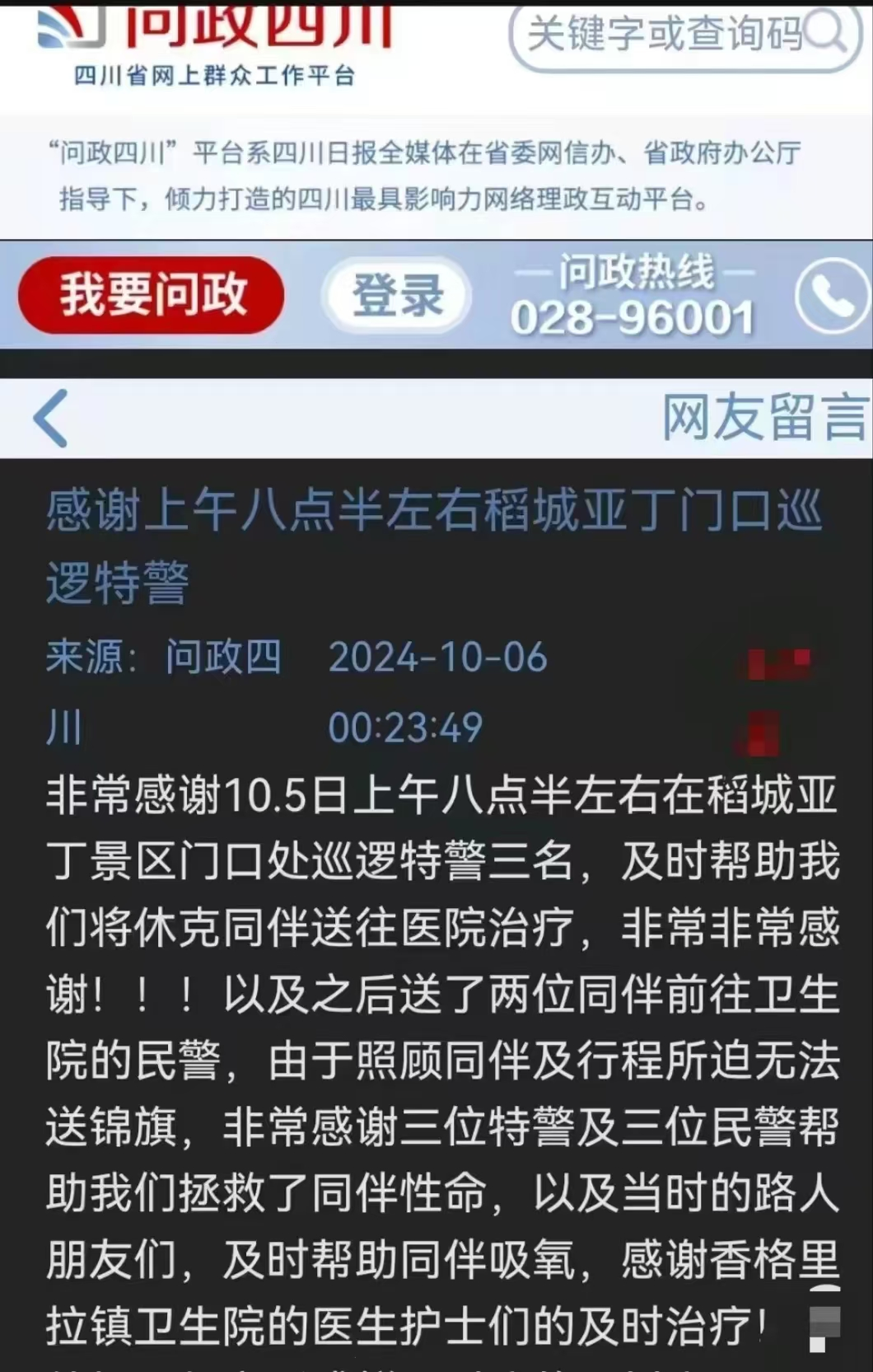 “非常感謝10月5日上午8點半,在亞丁景區(qū)門口的三位特巡警,將我們休克的同伴及時送往醫(yī)院治療。由于照顧同伴及行程所迫無法送錦旗,但這份恩情我們永遠銘記在心!”10月6日,一封來自游客的感謝信投遞在“問政四川”平臺上,信中充滿了他對眾多好心人的感激之情。據(jù)稻城縣公安局特巡警大隊副大隊長四郎澤仁介紹,10月5日,亞丁景區(qū)迎來眾多游客。我和隊員們正在景區(qū)門口的執(zhí)勤點位上執(zhí)勤,確保游客的安全和秩序。突然,聽到一陣急促的呼救聲,我們立刻循聲跑去,只見一名女游客倒在地上,身體不停地發(fā)抖,已經(jīng)陷入休克狀態(tài)。“面對這突如其來的緊急情況,我們按照日常養(yǎng)成的急救常識,立即對游客進行了初步判斷,根據(jù)其癥狀和表現(xiàn),我們判斷是由于缺氧所導致的,并立即對她進行了初步的搶救?!痹诔醪綋尵群螅撚慰偷那闆r雖有所緩解。于是,我和我的戰(zhàn)友們立即開辟起一條“綠色通道”,用警車將患者轉送至鎮(zhèn)衛(wèi)生院。為了不浪費任何一分鐘的治療時間,到達衛(wèi)生院后特巡警隊員將患者背上,送入診療室。當看到游客在醫(yī)生的救治下逐漸恢復意識,我們懸著的心也終于放了下來。那一刻,我們深深地感受到了作為一名警察的責任和使命。