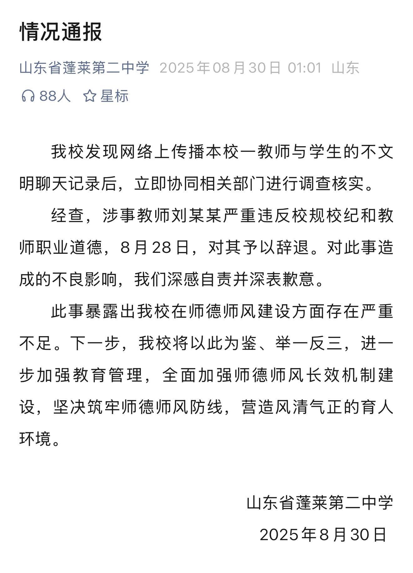 8月30日1點1分,山東省煙臺市蓬萊第二中學(xué)通過官方微信公眾號發(fā)布情況通報,對網(wǎng)傳“教師與學(xué)生不文明聊天記錄”事件進(jìn)行回應(yīng),通報原文如下: