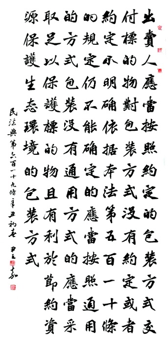 民法典第六百一十九條 出賣人應(yīng)當(dāng)按照約定的包裝方式交付標(biāo)的物。對(duì)包裝方式?jīng)]有約定或者約定不明確,依據(jù)本法第五百一十條的規(guī)定仍不能確定的,應(yīng)當(dāng)按照通用的方式包裝;沒有通用方式的,應(yīng)當(dāng)采取足以保護(hù)標(biāo)的物且有利于節(jié)約資源、保護(hù)生態(tài)環(huán)境的包裝方式。